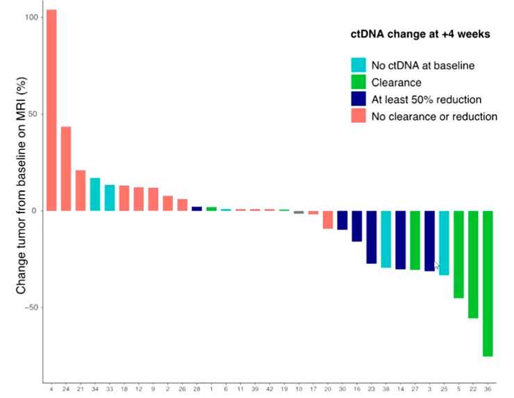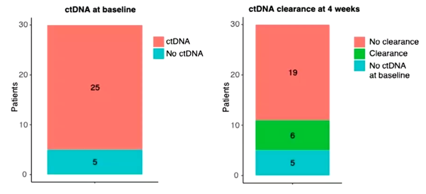 虽然基线CD8+ T细胞水平与应答无关,但空间分析显示,越靠近肿瘤细胞的CD8+ T细胞,与应答越相关(P=0.0014)。nivo+ipi治疗4周后,24%(6例)的患者ctDNA明显清除。基线水平可检测到循环肿瘤DNA占83%(25例)。