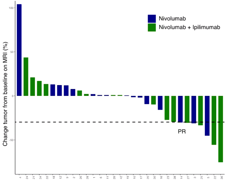 研究结果显示,4周后,7/31(23%)的患者出现明显的部分缓解(PR),其中接受nivo治疗的患者中有3/16例(19%)达到PR,接受nivo+ipi治疗的患者有4/15例(27%)达到PR。7例患者中,有3例患者TIL高表达,4例TIL中表达,而TIL低表达患者中没有患者达到PR。这也提示,TIL似乎能够很好的预测患者治疗的疗效。