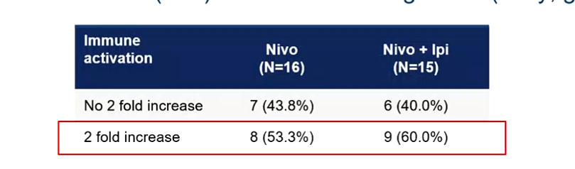 4周治疗后,17/31例(58%)患者检测到免疫激活,其中8例(53.3%)接受nivo治疗,9例(60.0%)接受nivo+ipi治疗。所有PR患者的TIL水平均高于40%。PR患者的IFNγ表达较基线水平高(P=0.014)。