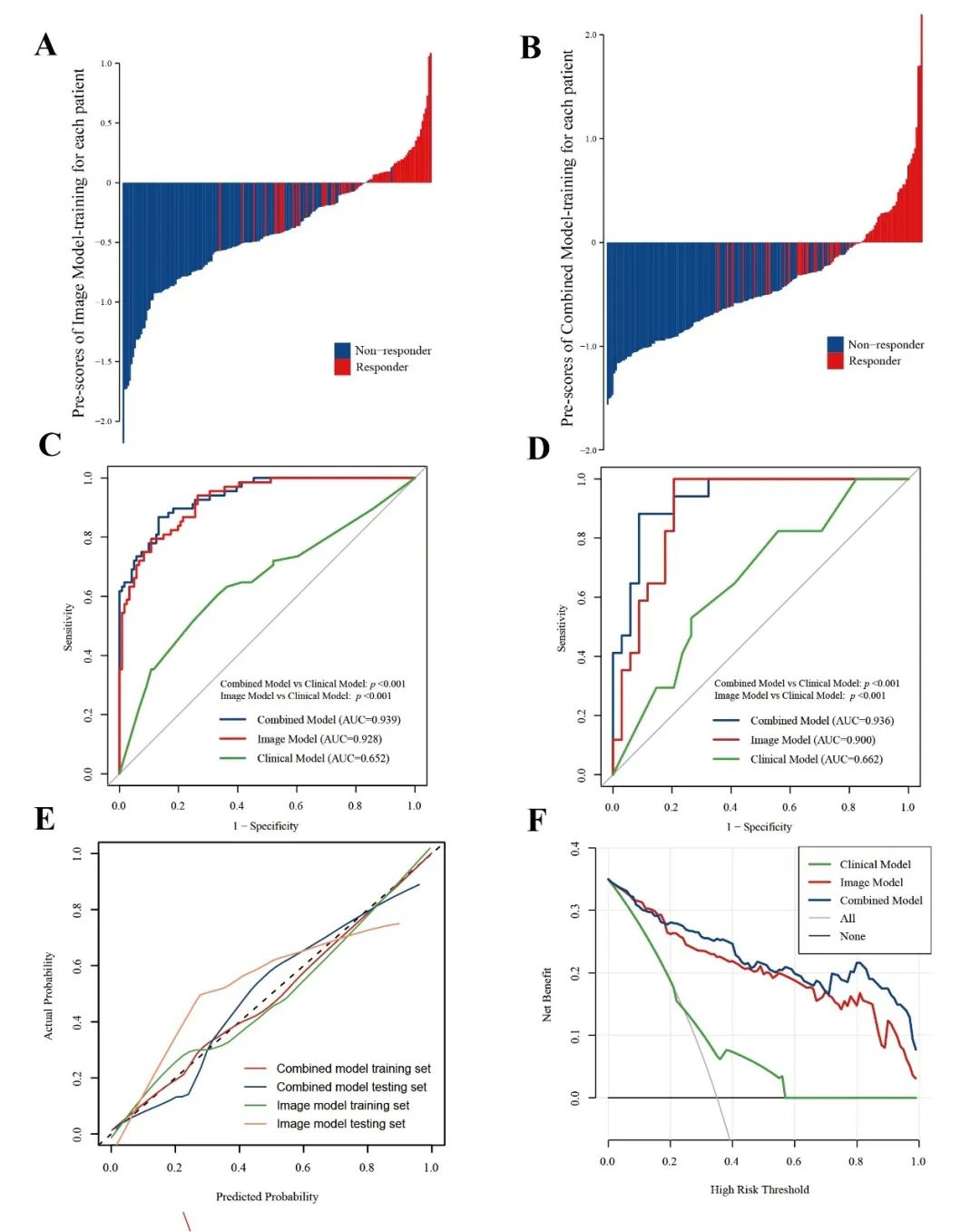 研究表明,影像模型的曲线下面积(AUC)在训练集中分别为0.928(95%CI:0.893~0.963)和在验证集中的0.900(95%CI:0.816~0.983),均显著优于临床模型的性能(训练组为0.658,验证集为0.712),其准确性(ACC)在训练集和测试集中分别达:85.7%和86.3%。我们发现,与影像组学模型相比,临床-影像组学联合模型在训练队列(AUC=0.939,95%CI:0.908~0.971)和验证队列(AUC=0.936,95%CI,0.872-0.999)方面均显示出增加但无统计学差异的预测能力。在亚组分析中显示,影像组学模型不受PD-L1状态、肿瘤转移负荷或分子亚型的影响。