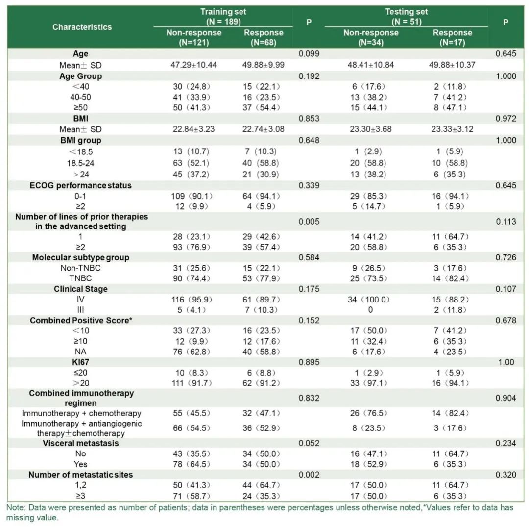 研究结果:入选的240例患者中,6.7%的患者疗效为CR,28.8%的患者为PR,42.1%的患者为SD,总的疾病控制率(DCR)为77.5%,免疫联合治疗反应在训练集和测试集中是均衡的。
