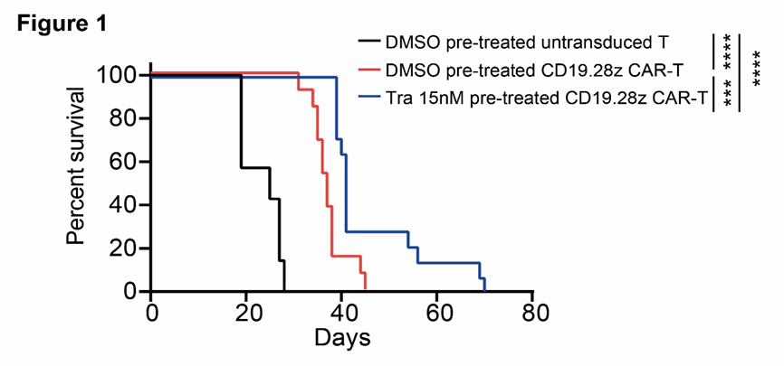 为了探索MEK抑制剂是否可以减轻抗原非依赖性CAR强直信号(tonic signaling)传导的不利影响,我们将CD19.28z CAR-T细胞分别在含MEK抑制剂曲美替尼(trametinib)、考比替尼(cobimetinib)和比美替尼(binimetinib)的培养基中培养9天,以上3种MEK抑制剂均已经FDA批准用于临床,所用浓度分别为它们血药浓度的峰值。我们发现这3种MEK抑制剂都可以减少CAR-T细胞的终末分化,抑制耗竭和激活标志物的表达。其中,曲美替尼是最有效的,因为它可以在最低浓度下达到与考比替尼和比美替尼相当的效果。因此,我们选择曲美替尼进行进一步研究。我们证实,与7.5nM和30nM相比,15nM是曲美替尼的最佳浓度,在该浓度下曲美替尼对CAR-T细胞的表型有很强的影响,而对CAR-T细胞的增殖仅有轻微抑制作用。曲美替尼预处理不影响CD19.28z CAR-T细胞的体外细胞毒性。随着治疗时间的延长和剂量的增加,曲美替尼的上述作用更为显著。为了确定MEK抑制剂是否对使用其他scFv和共刺激结构域的CAR-T也起上述作用,我们将曲美替尼分别加入CD19.4-1BBz和GD2.28z CAR-T细胞的培养基中,也取得了类似的结果。有趣的是,因为GD2.28z CAR-T更容易耗竭,在含曲美替尼的培养基中培养的GD2.28z CAR-T细胞具有更好的增殖和杀伤能力。在体内实验中,我们发现与DMSO预处理的CD19.28z CAR-T细胞相比,曲美替尼预处理的CD19.28z CAR-T细胞具有更强的抗白血病活性,耗竭和分化程度更低,增殖更好,进一步延长了小鼠存活期(图1)。用CD19.4-1BBz CAR-T细胞进行体内实验可获得相似的结果。为了评估曲美替尼是否可以保护CAR-T细胞免受抗原刺激引发的耗竭和终末分化,我们将CD19.28z CAR-T细胞与Nalm-6细胞在含有或不含有曲美替尼的培养基中共培养。我们证明在抗原刺激下,曲美替尼可有效抑制CAR-T细胞的活化、耗竭、凋亡、终末分化和ERK磷酸化,从而促进总CAR-T和CD8 CAR-T细胞的增殖。此外,在重复抗原刺激后,曲美替尼可以挽救CAR-T细胞的功能衰竭,提高CAR-T细胞的体外细胞毒性。