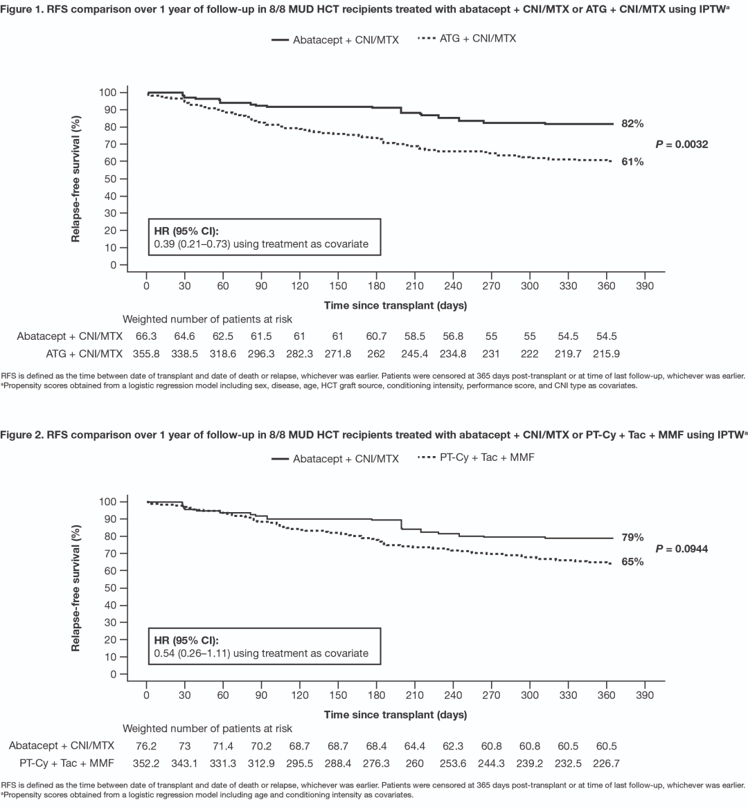对于8/8 MUD受体,图1显示ABA+CNI/MTX的RFS显著高于ATG+CNI/MTX(分别为82%[69-90%]和61%[55-66%]);P=0.0032;HR(95%CI):0.39(0.21-0.73)。图2显示了ABA+CNI/MTX和PT-Cy的RFS比较(分别为79%[61-90%]和65%[60-70%]);P=0.0944;HR(95%CI):0.54(0.26-1.11)。
