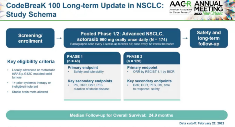 2022年AACR年会期间提交的1/2期CodeBreaK 100试验(NCT03600883)的最新数据显示,根据长期随访,Sotorasib在KRAS G12C突变的非小细胞肺癌(NSCLC)患者中显示出非常有意义和持久的疗效,2年总生存(OS)率令人印象深刻。[1,2]