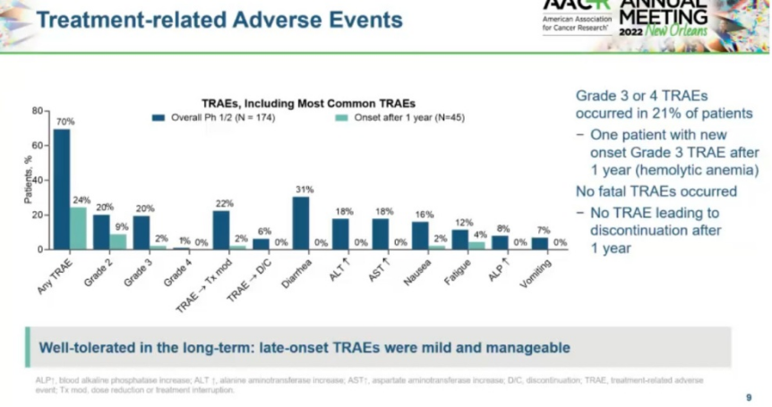 总体而言,大多数毒性的严重程度为1/2级;主要AE是胃肠道AE,伴有恶心、腹泻、肝功能检测异常。