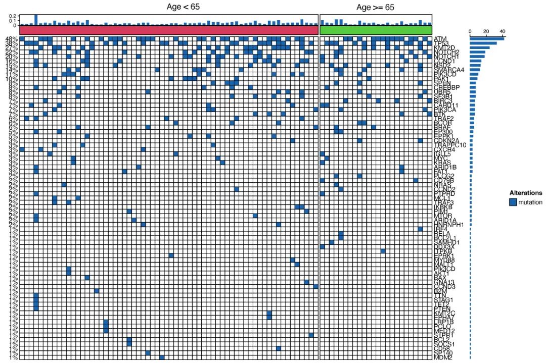 北医三院血液科多年来致力于MCL淋巴瘤的基础与临床研究。我们近期的一项研究对104例MCL患者基因进行了分析,发现CARD11、TARF2、TP53这三个基因与患者的OS密切相关;同时,通过病理组织和cfDNA进行基因分型,在比较老年MCL与年轻MCL的突变图谱中发现(图2),老年MCL有3个较高频突变基因:BIRC3、PLCG2和CD79B。
