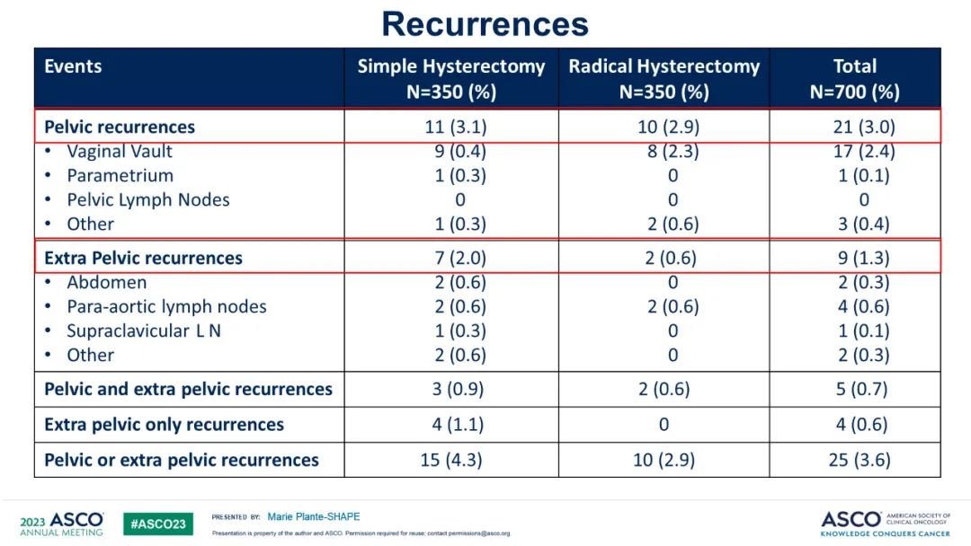 单纯子宫切除术组(n=350)和根治性子宫切除术组(n=350)的盆腔复发的发生率为3.1%和2.9%,盆腔外复发的发生率分别为2.0%和0.6%。