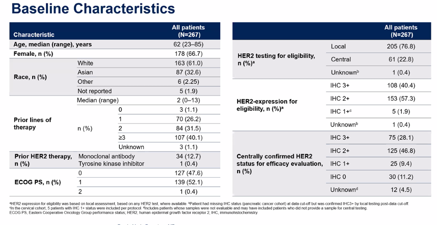 DPT-02研究共纳入了267例患者,在整体研究中,71.6%的患者经过了≥2线治疗,经中心实验室确认的HER2 IHC3+的患者为28.1%,2+的患者为46.8%。