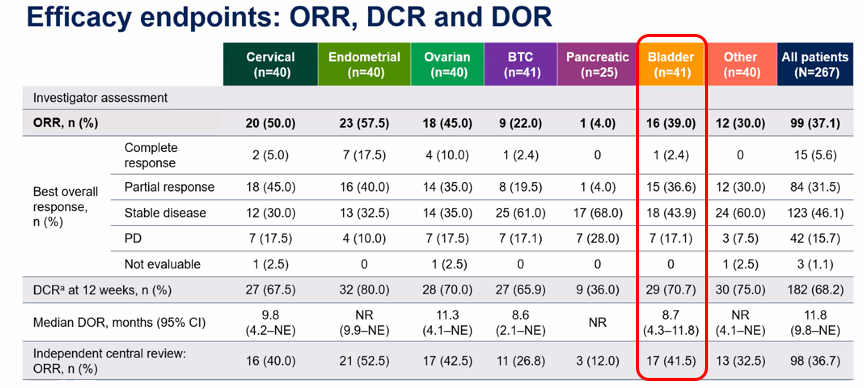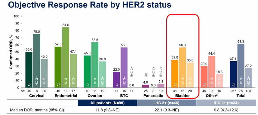 DPT-02研究纳入了41例至少经过≥2线治疗的晚期尿路上皮癌患者,HER2 IHC 2+和3+的患者分别为20例、16例。结果显示,整体ORR为39.0%(独立中心评估为41.5%),其中在HER2 IHC2+和3+患者中,ORR分别为35.0%和56.3%(出现了1例完全缓解),12周的疾病控制率(DCR)为70.7%,中位缓解持续时间(DOR)为8.7个月(4.3-11.8),有23.2%的患者出现了12个月的反应率。