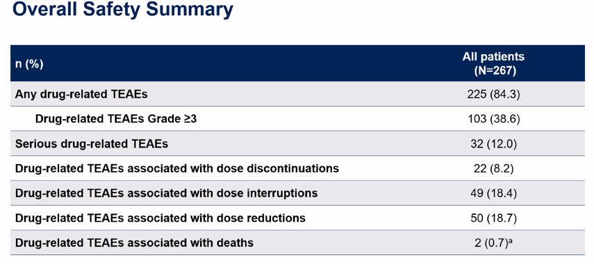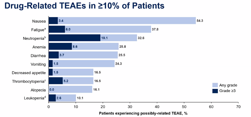 在整个DP-02研究的安全性数据分析(N=267)中显示,药物相关的≥3级的不良反应发生率为38.6%,因不良反应引起的停药、中断治疗及药物减量发生比例分别为8.2%,18.4%和18.7%。发生率≥10%的药物相关任何级别AE分别是恶心(54.3%),乏力(37.8%),中性粒细胞减少(32.6%)和贫血(25.8%)等。本研究的不良反应与既往已知的DS-8201报道的不良反应一致,未出现新的安全性信号,整体安全性是可控,可耐受的。