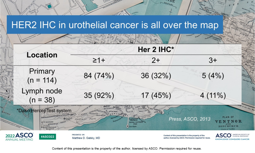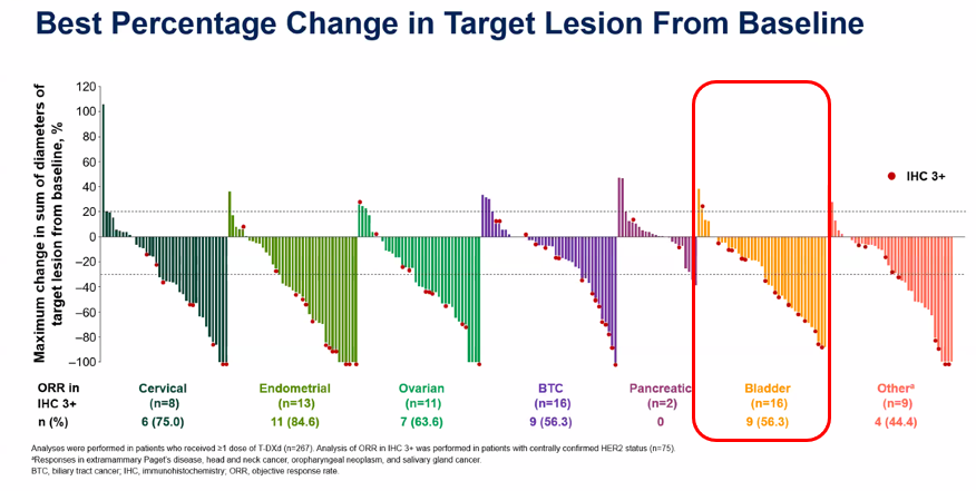这是Enhertu单药首次在尿路上皮癌的数据探索,展现出了非常具有前景的疗效和安全性,PFS和OS数据正在随访中。既往有研究发现,HER2 2+和3+在尿路上皮癌中的表达率为36%-56%,其中淋巴结中的表达比例高于原发灶。这意味着,HER2 ADC为这部分患者提供了更加优化的治疗选择。