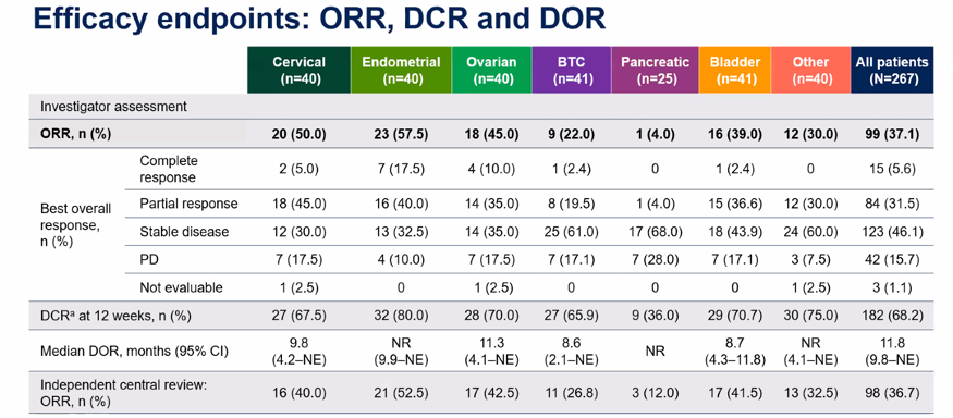 研究结果显示,在267位患者中,总人群的ORR达到37.1%,中位DoR达到11.8个月,12周的DCR达到68.2%,Enhertu显示出高效且持久的疾病控制(胰腺癌ORR为4%,疗效有限)。而且在HER2 2+和3+的整体人群中均表现出显著疗效:对于HER2 2+的人群,整体ORR为27.2%,中位DCR为9.8个月;HER2 3+人群的整体ORR为61.3%,中位DCR为22.1个月。而安全性与既往研究相似,未观察到新的不良反应。
