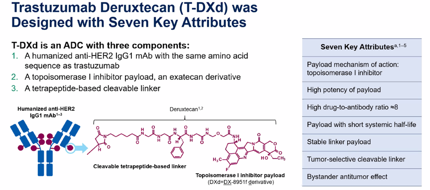 Enhertu是一款靶向HER2的抗体偶联药物(ADC),由人源化IgG1单抗、DNA拓扑异构酶I抑制剂和酶促裂解四肽连接子(GGFG)组成,采用半胱氨酸残基的定点偶联。已在国外获批多种适应症。目前在中国获批的适应症为,单药适用于治疗既往接受过一种或一种以上抗HER2药物治疗的不可切除或转移性HER2阳性成人乳腺癌患者。