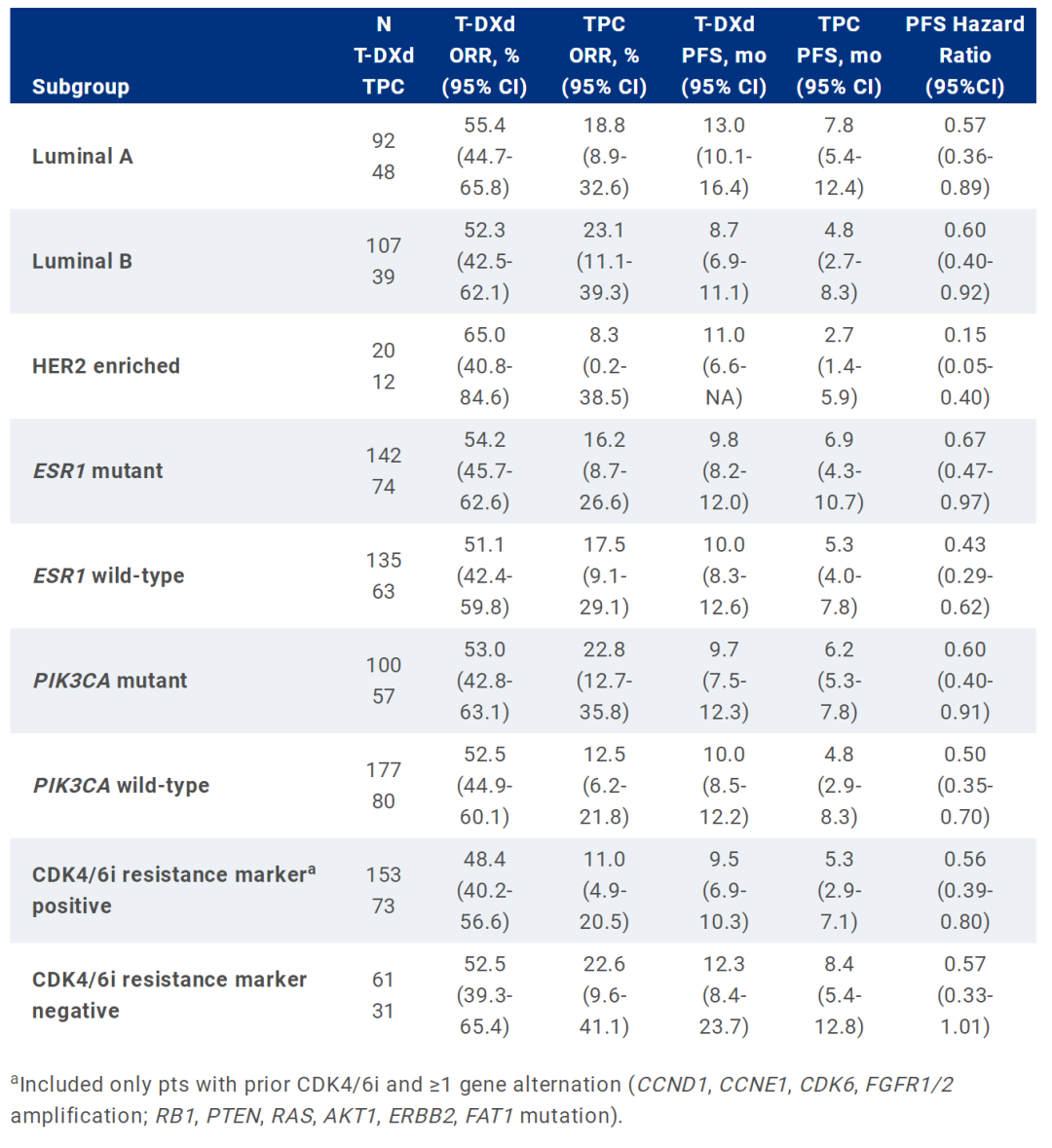 在HR+患者的ctDNA检测中,T-DXd和TPC组分别有51.3%和54.0%存在ESR1突变,36.1%和41.6%存在PIK3CA突变,71.5%和70.2%存在CDK4/6i耐药标志。总体来看,ESR1突变、PIK3CA突变、CDK4/6耐药标志的患者也是都可以从T-DXd治疗中获益。这些耐药突变的患者本身预后较差,但T-XDd的疗效提高幅度并没有受到这些耐药突变的影响。