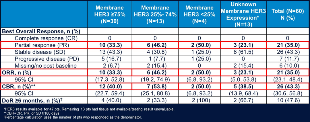 这种药物优势还可以在其他靶点的ADC中进行复制,也就是说我们可以基于更多的分子靶点来设计ADC,例如HER3(HER3-DXd)、Trop-2(Dato-DXd)、B7-H3(DS-7300)等多个靶点的新型ADC。这次ASCO大会报道的一项2期研究的Part A结果,入组的HR+患者接受过0-2线化疗和内分泌+CDK4/6i;TNBC患者接受过1-3线化疗。HER3-DXd在总体人群的ORR为35%,而且不同HER3表达水平(≥75%、25%~74%、≤25%)的患者均有治疗反应,疗效没有明显差异。