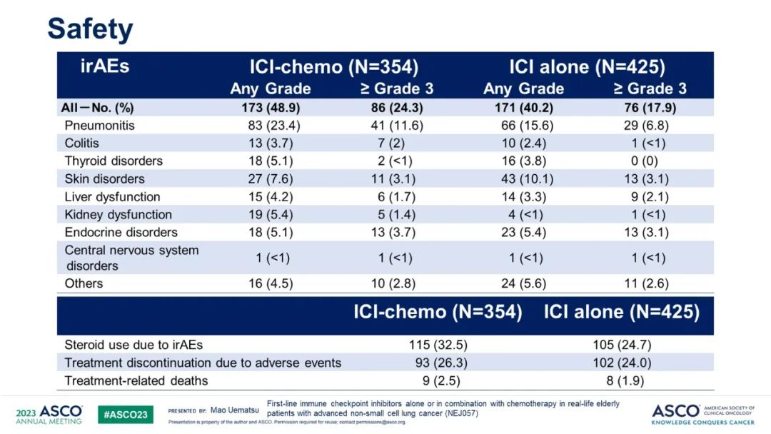 安全性方面,ICI+化疗组有86例(24.3%)患者发生≥3级免疫相关不良事件(irAEs),ICI单药组有76例(17.9%)患者发生≥3级irAEs(P=0.03)。ICI+化疗组和ICI单药组中分别有115例(32.5%)和105例(24.7%)需要类固醇治疗irAE(P=0.02),分别有83例(23.4%)和66例(15.6%)患者发生肺炎(P=0.006)。