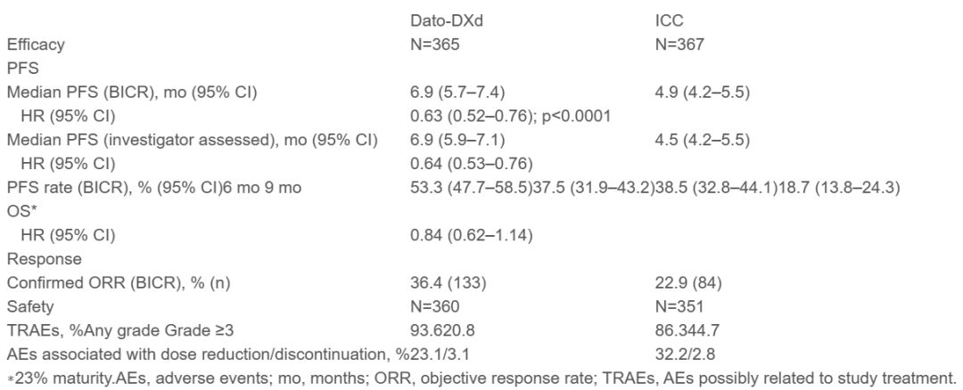 LBA11-开创性的TROPION-Breast01试验III期结果揭示了Dato-DXd在既往治疗的HR+/HER2-癌症中有希望的结果。将732名既往在内分泌治疗中出现进展,并接受过1~2线系统化疗的患者,随机分配接受Dato-DXd或研究者选择的化疗(ICC)。结果显示,与ICC相比,Dato-DXd显示出显著的PFS改善(HR为0.63,P<0.0001);Dato-DXd的中位PFS为6.9个月(由BICR评估),而ICC为4.9个月;OS数据尚不成熟,但观察到了有利于Dato-DXd的趋势;与接受ICC治疗的患者相比,接受Dato-DXd治疗的患者出现≥3级治疗相关不良事件(TRAEs)和剂量减少的比率较低。TROPION-Breast01试验实现了其PFS的主要终点,为既往接受1~2线化疗的无法手术或转移性HR+/HER2-乳腺癌患者带来了希望。这些结果支持Dato-DXd作为一种新的有效治疗选择,带来PFS统计学意义和临床意义的双重改善。