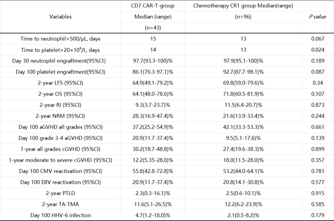 表2.CD7 CAR-T和化疗组allo-HSCT后的临床结果和并发症