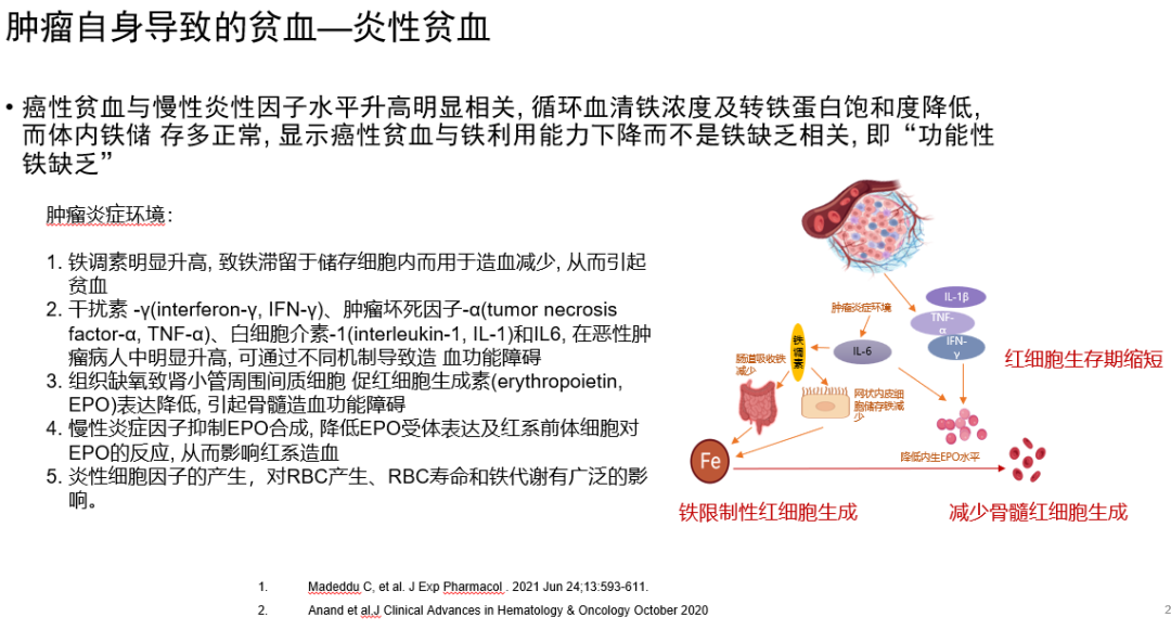 肿瘤炎症环境产生的炎症因子是一项不可忽视的因素。炎症因子会通过不同机制导致造血功能障碍,对红细胞(RBC)产生、RBC寿命和铁代谢有广泛的影响。组织缺氧致肾小管周围间质细胞EPO表达降低,也会引起骨髓造血功能障碍;同时慢性炎症因子也会抑制EPO合成,降低EPO受体表达及红系前体细胞对EPO的反应,从而影响红系造血[19]。深入了解CIA发生机制,将有利于针对性寻求优化治疗策略。