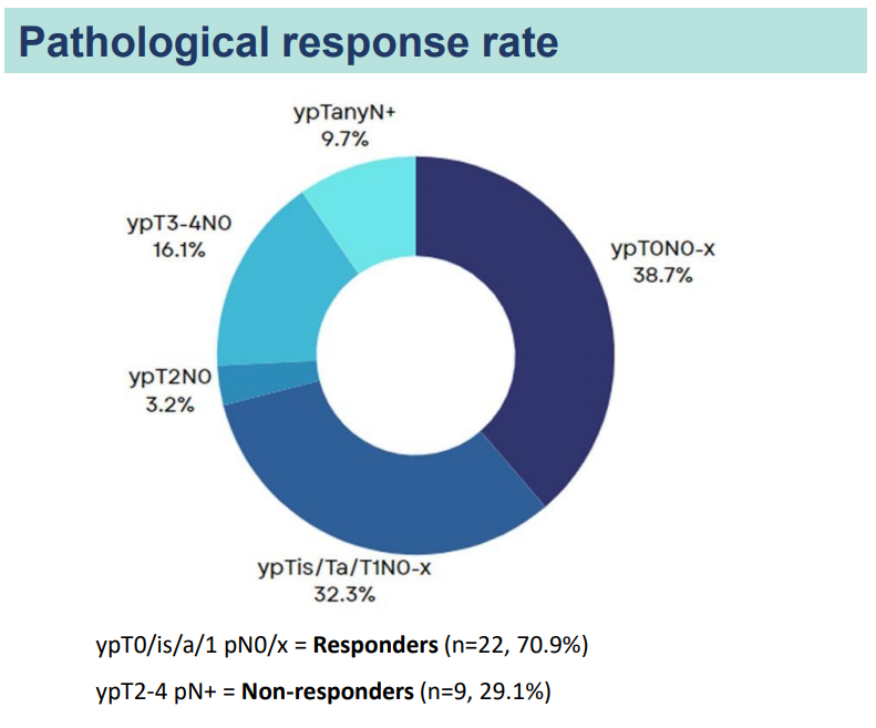 我国学者则报道了替雷利珠单抗联合GC方案(吉西他滨+顺铂)新辅助治疗的单臂研究(摘要号:A0904)[5]。共有14/15例患者完成3-4个疗程的新辅助治疗和根治性手术,病例确认5例(50%)患者达到pCR(ypT0N0),9例(64.2%)患者达到降期(ypT2N0),11例(78.5%)患者达到完全淋巴缓解(pN0),1例患者因AE停用替雷利珠单抗。
