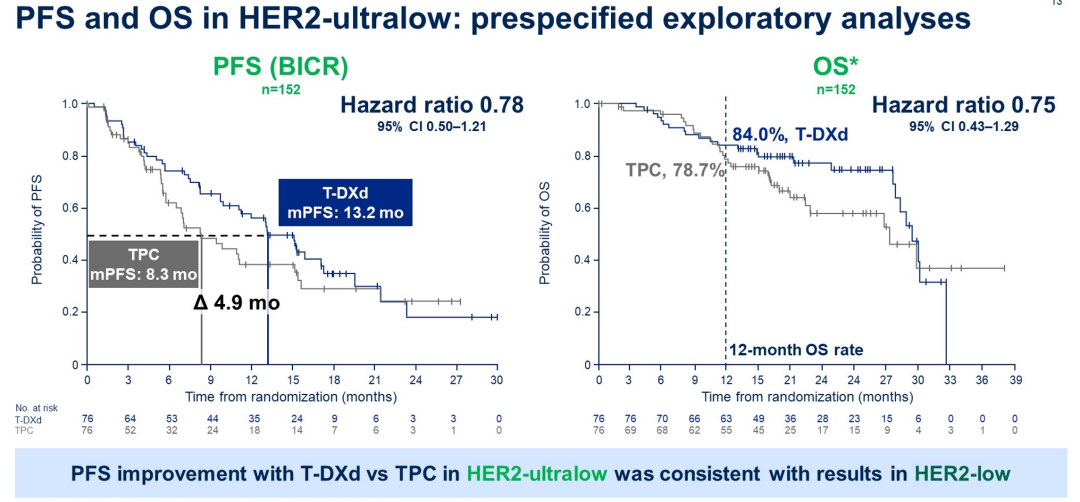 这次ASCO大会报道了DB-06研究的结果。该研究入组人群相较于DB-04更加靠前线,为内分泌治疗失败但未接受过化疗的患者,而且包括HER2低表达(IHC 1+或1+且ISH-)和HER2超低表达(IHC介于0~1+)的患者。研究结果显示,无论是HER2低表达还是超低表达,T-DXd与化疗相比,能够带来接近5个月的PFS延长。因此,我认为这一结果有望改变我们的临床实践。随着对ADC药物在HER2低表达患者中应用的认识加深,我们将为这部分患者提供更有效、更个性化的治疗方案。