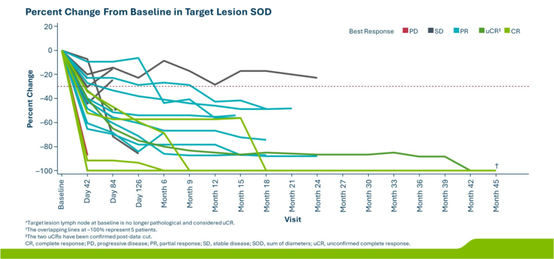 在安全性方面,TEAE与已知的药物安全特性一致。最常见的≥3级TEAE包括血小板减少症、中性粒细胞减少症和贫血(45.5%)。