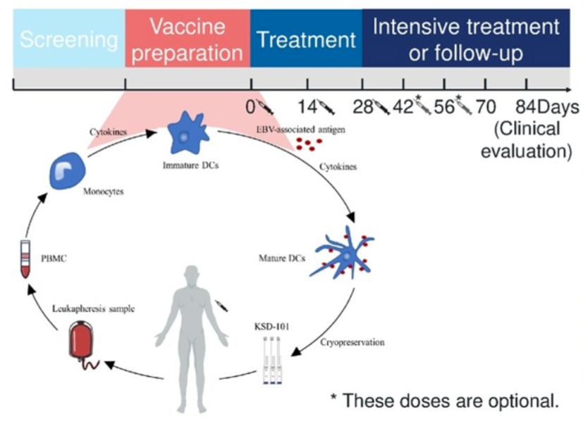 本研究的一个重要创新在于,首次将一种基于自体树突状细胞的疫苗(KSD-101)系统性应用于多亚型EBV驱动的血液系统恶性肿瘤。该疫苗由患者自体DC负载EBV类肿瘤复合抗原,可高效呈递广谱EBV抗原,从而激活多克隆、HLA非依赖性的病毒特异性T细胞应答,有效克服传统EBV-CTL或肽类疫苗在抗原谱狭窄与HLA配型要求上的局限。